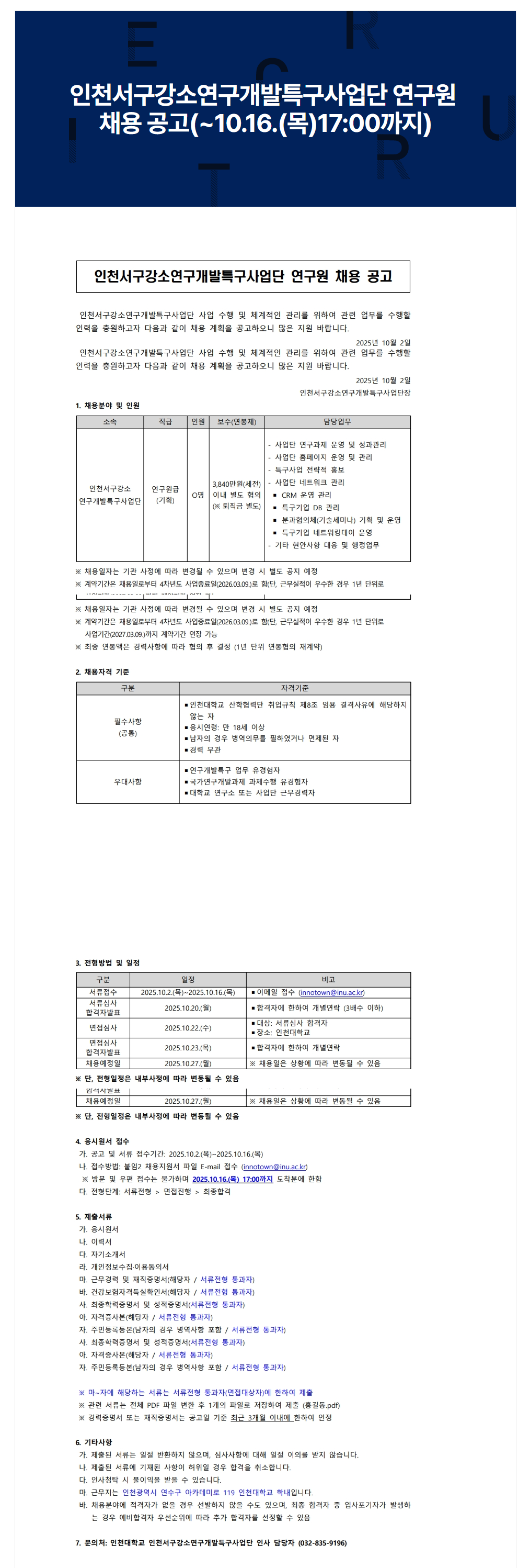 [채용] 인천서구강소연구개발특구사업단 연구원 채용 공고(10.16.(목) 17:00까지)