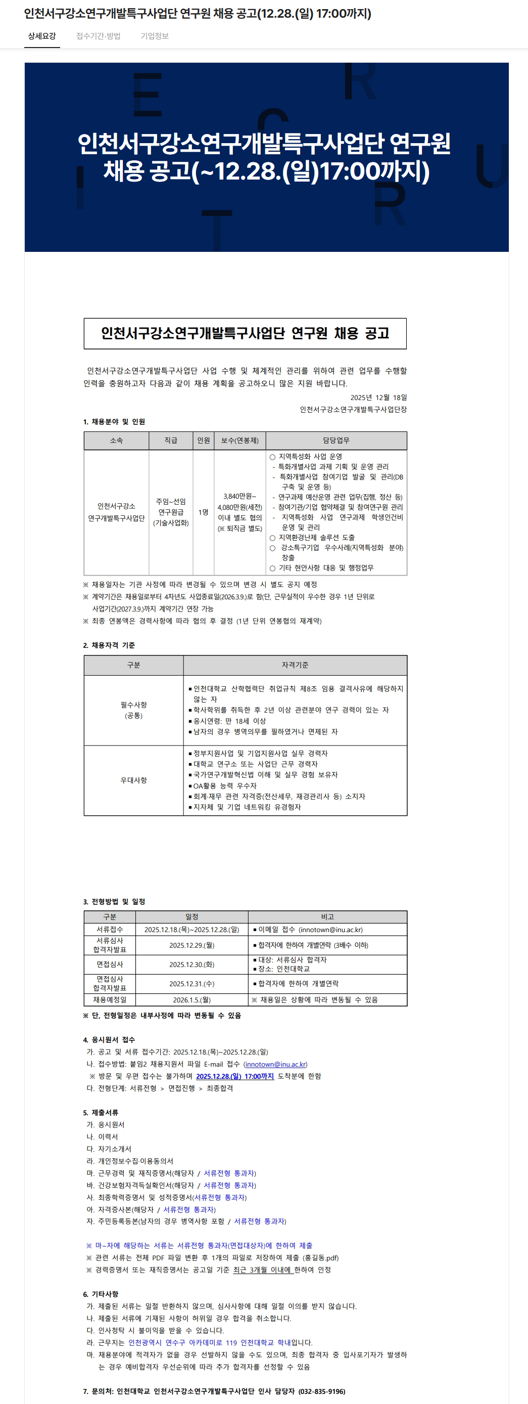 인천서구강소연구개발특구사업단 연구원 채용 공고(12.28.(일) 17:00까지)