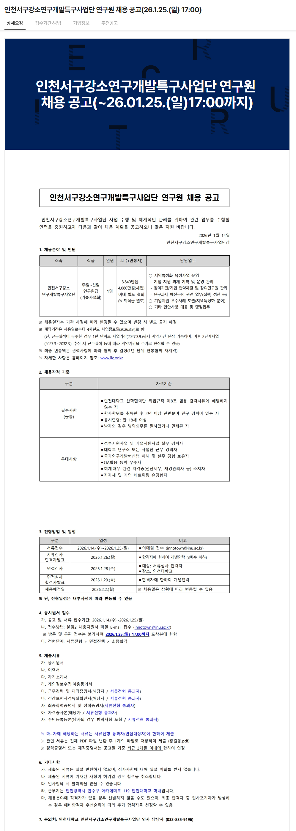 인천서구강소연구개발특구사업단 연구원 채용 공고(26.1.25.(일) 17:00까지)