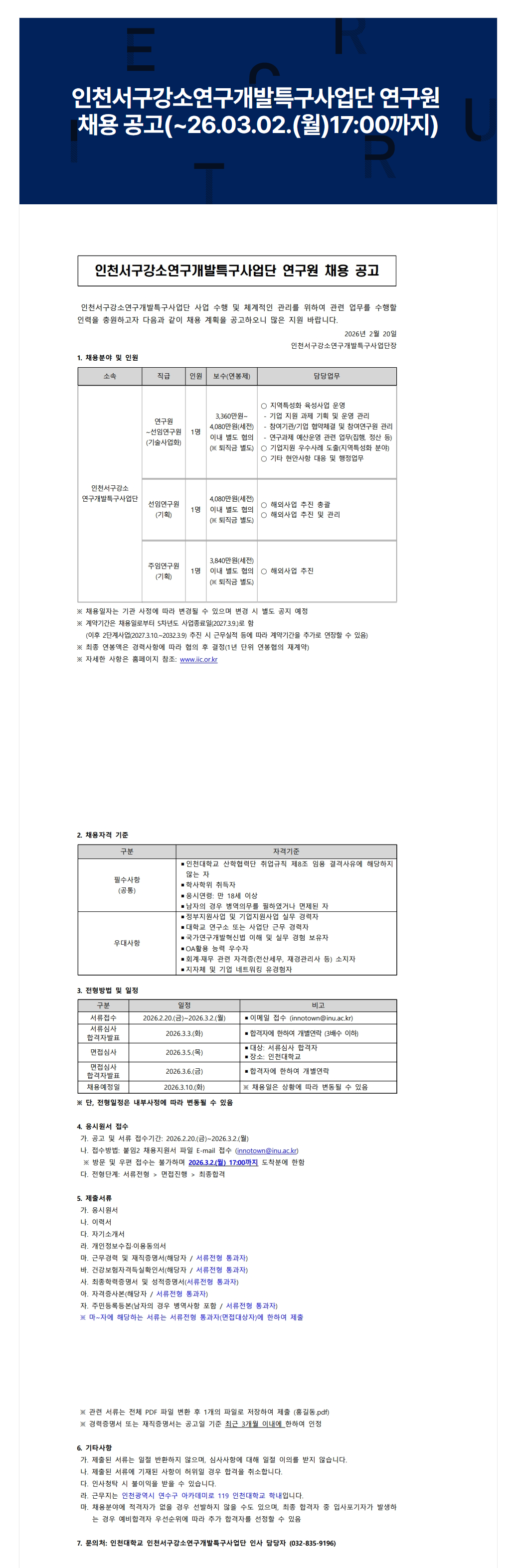 인천서구강소연구개발특구사업단 연구원 채용 공고(26.3.2.(월) 17:00까지)