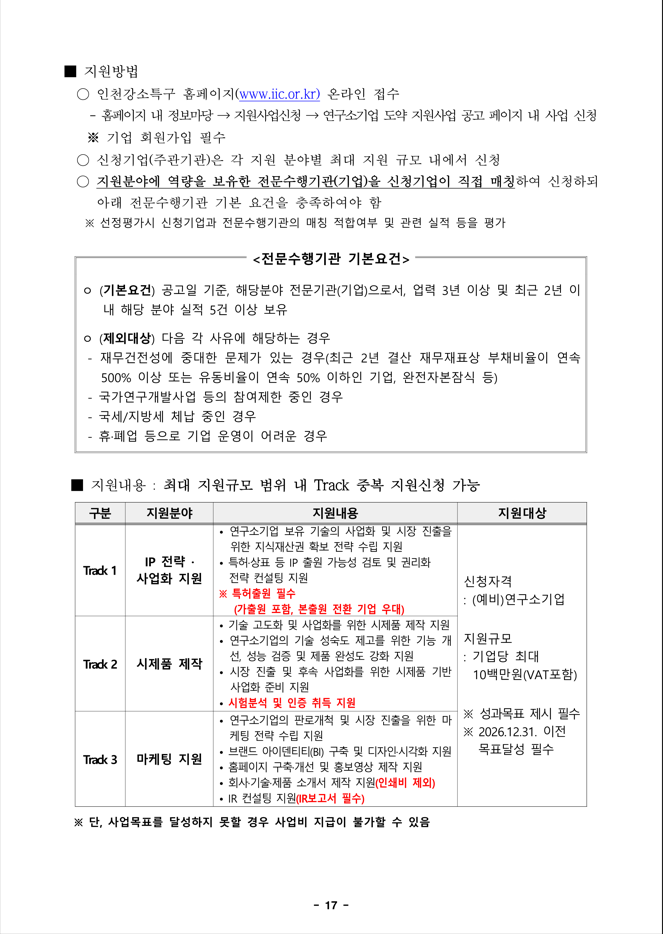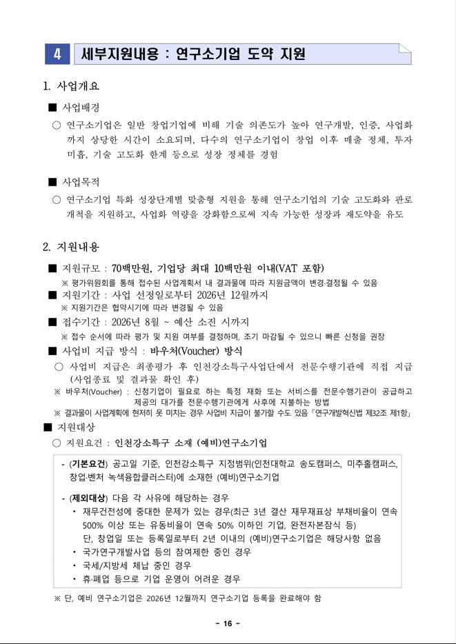 인천강소특구는 특구입주 연구소기업의 성장단계별 맞춤형 지원을 통해 연구소기업의 기술 고도화와 판로개척을 지원하는 「2026년 인천강소특구 연구소기업 도약 지원사업」을 다음과 같이 공고하오니, 관심 있는 기업의 많은 참여를 바랍니다.